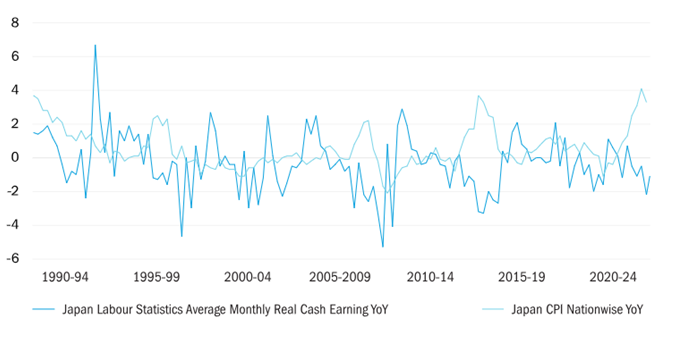 Oggi, questa tendenza a non aumentare i prezzi sta subendo un cambiamento radicale. Infatti, in seguito all’ultima impennata dei costi, le aziende hanno provveduto ad aumentare i prezzi per proteggere i loro guadagni. Questo cambio di rotta rappresenta una rottura significativa rispetto al passato, quando le aziende proteggevano i consumatori dall’aumento dei costi, pur subendo una riduzione dei loro margini di guadagno. Inoltre, sta avvenendo un cambiamento anche nei confronti degli aumenti salariali. Infatti, i salari stanno crescendo al ritmo più veloce degli ultimi da 20 anni. Tuttavia, questo non dimostra che la mentalità deflazionistica del Giappone stia cambiando, considerando che la crescita dei salari non ha tenuto il passo dell’inflazione e i redditi reali sono diminuiti. Per il momento non vediamo nemmeno prove evidenti del fatto che, in un contesto di carenza di manodopera, i lavoratori chiedano salari più alti – anche se ciò potrebbe essere vero in alcune sacche della forza lavoro.