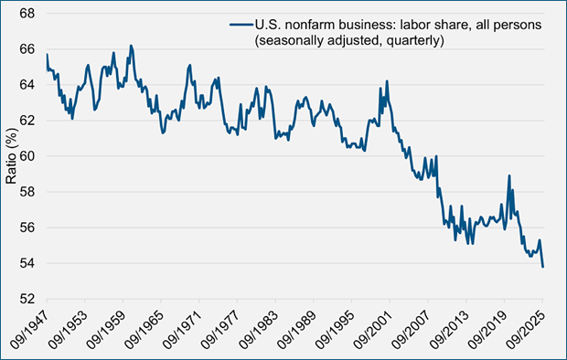 Gli ultimi dati relativi alla produttività e al costo del lavoro negli Stati Uniti illustrano chiaramente le tendenze divergenti alla base della crescita economica resiliente, la cosiddetta economia a forma di K. Nel terzo trimestre del 2025, la produttività statunitense è cresciuta di circa il 2% rispetto all’anno precedente, in linea con la media del periodo post-pandemico e ben al di sopra delle tendenze registrate in altri mercati sviluppati. Tuttavia, i lavoratori statunitensi non sono stati in grado di trarre il massimo vantaggio dalla loro maggiore produttività. Infatti, la quota di reddito dei lavoratori statunitensi è scesa al minimo storico in un periodo di tempo che copre quasi otto decenni (vedi Figura 1).