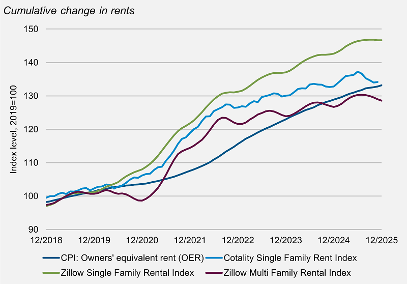 Allo stesso tempo, l’inflazione degli affitti sta rallentando rapidamente. I nuovi dati sui contratti di locazione di Zillow mostrano aumenti dei canoni a un tasso annuo del 2,1%, quasi il 50% in meno rispetto alla norma pre-COVID. L’inflazione degli affitti delle abitazioni unifamiliari, misurata da Cotality, è ancora più bassa, con una crescita inferiore all’1% annuo per la prima volta dalla crisi finanziaria globale. Anche il divario tra i canoni di locazione dei nuovi contratti e quelli dei rinnovi si è in gran parte normalizzato, alleviando un’altra fonte persistente di inflazione nel mercato degli affitti.