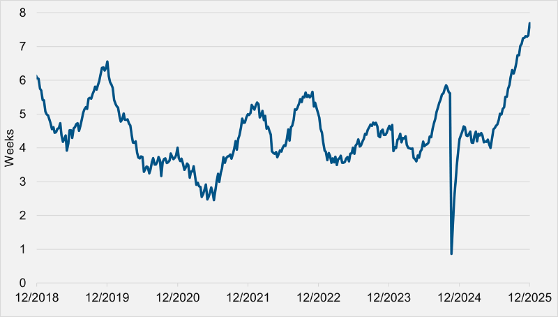 Le prospettive per l’inflazione degli affitti non sembrano molto diverse. Sebbene il ritmo della nuova offerta abitativa abbia già subito un rallentamento, i dati mostrano anche che le case in affitto rimangono sul mercato più a lungo (vedi Figura 3), il che potrebbe spingere i proprietari a ridurre ulteriormente gli affitti sia per i nuovi contratti che per i rinnovi nei mesi a venire.