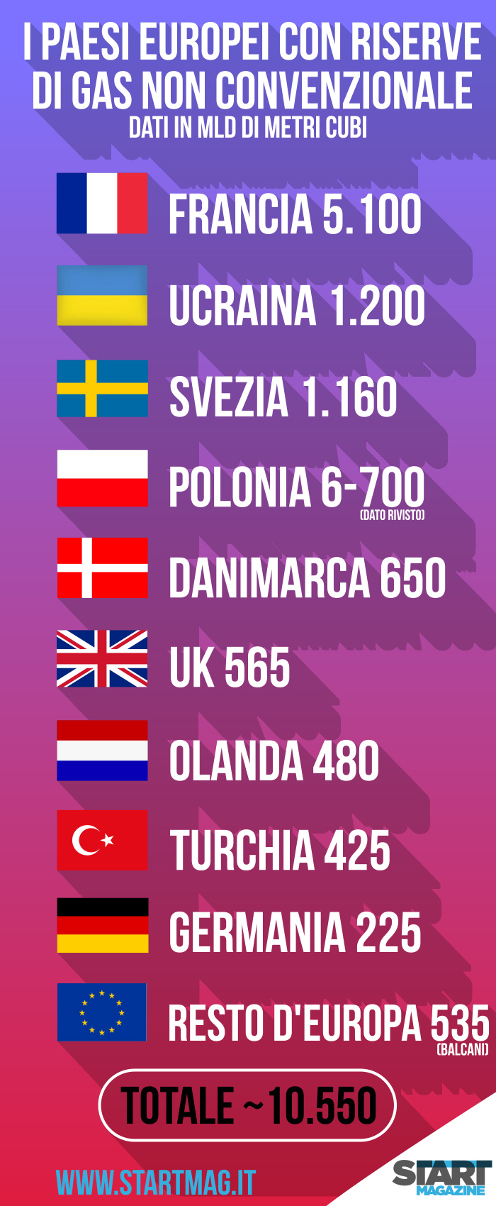Secondo le previsioni della Iea (International Energy Agency), in Europa ci sarebbero 22 mila miliardi di metri cubi di gas non convenzionale (shale gas, tight o coal bed methane). Dal canto suo, invece, la Eia (Energy Information Administration) stima qualcosa come 14/17 mila miliardi di metri cubi di shale gas. Ma non tutta questa enorme quantità di gas (ipotizzata) si potrebbe sfruttare, perché non sempre è facile, o conveniente dal punto di vista ambientale, estrarre shale gas.