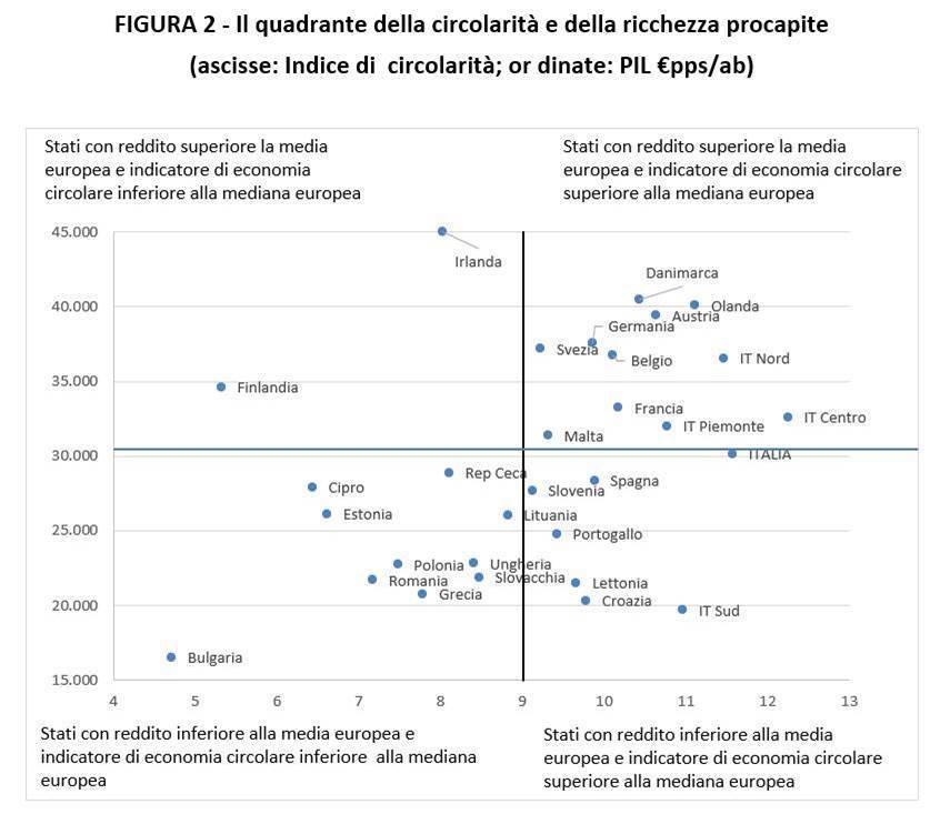 Come ha spiegato presentando il Rapporto Duccio Bianchi, non c’è rapporto diretto tra ricchezza di un Paese e sue performance “green”: i Paesi a basso reddito generalmente vanno meglio negli indicatori d’impatto perché consumano meno energia e meno materia (procapite), quelli più ricchi spesso hanno livelli più elevati di efficienza energetica e di buona gestione dei rifiuti. Ma come si vede bene rappresentando graficamente le posizioni di ogni Paese rispetto al reddito procapite e al livello di circolarità (V. FIGURA 2), tra le due dimensioni la correlazione è molto parziale: così, per esempio, la Finlandia e il Nord italiano – un Paese e una macroregione tra i più ricchi d‘Europa – quanto ad economia circolare si collocano una in fondo e l’altra i. cima alla classifica.