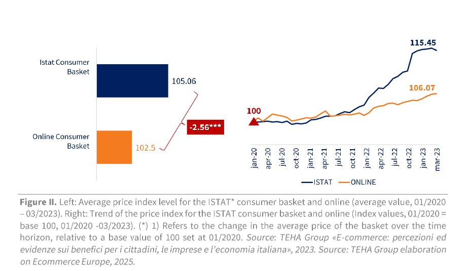 I dati sono significativi: dal 2020 al 2025, i prezzi medi online nell’Ue sono stati 6,9 punti percentuali più bassi rispetto ai prezzi offline. Questa sostanziale differenza dimostra come l’e-commerce generi una maggiore competitività nel settore retail a vantaggio dei clienti, a prescindere dal fatto che acquistino online o nei negozi fisici. Si comprende come mai mentre spesso i negozianti che operano esclusivamente sul piano fisico lamentino una forte diminuzione dei consumi conseguente all’aumento dei prezzi, l’e-commerce di contro continui a espandersi, avendo ormai raggiunto i 958 miliardi di euro di ricavi B2C nel 2024 (+50,4% rispetto al 2019).