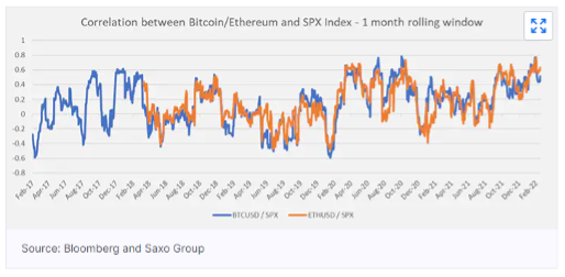 Durante questi primi due mesi dell’anno il mercato delle criptovalute è stato altamente correlato con il mercato azionario come documentato dalle ricerche di Anders Nysteen, Senior Quantitative Analyst presso Saxo Bank. A partire dal 2022, infatti, la correlazione tra i rendimenti giornalieri dell’indice S&P 500 e Bitcoin è stata compresa tra 0,56 e 0,61, a seconda della misura di correlazione e della fonte. Al contrario, la correlazione era solo di circa 0,25 nel 2021. Sembra che il mercato delle criptovalute sia stato in larga misura guidato dagli stessi fattori dei mercati azionari, ovvero le preoccupazioni per l’inflazione e la tensione Russia-Ucraina. Quest’anno un sentiment di rischio ha attraversato l’azionario, messo a dura prova anche dallo scivolamento dei titoli tecnologici. Contemporaneamente, il mercato delle criptovalute è stato influenzato dal fatto che un numero maggiore di trader di azioni tradizionali ha allargato i propri investimenti anche alle criptovalute: questo significa che il loro portafoglio bilancia il proprio rischio tra le azioni e criptovalute. Di conseguenza, le criptovalute potrebbero non fornire lo stesso grado di diversificazione rispetto al passato.