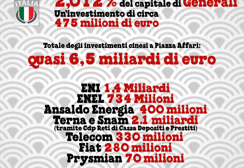 L’ultimo in ordine di arrivo, il 2,012% di Generali, la più grande compagnia assicurativa in Italia, quarto gruppo per dimensioni nel mondo. Il gruppo assicurativo italiano fondato nel 1831 vede così salire al 15% la quota totale di partecipazioni straniere nel proprio azionariato. La quota acquisita dai cinesi ha un valore di 475 milioni di euro.