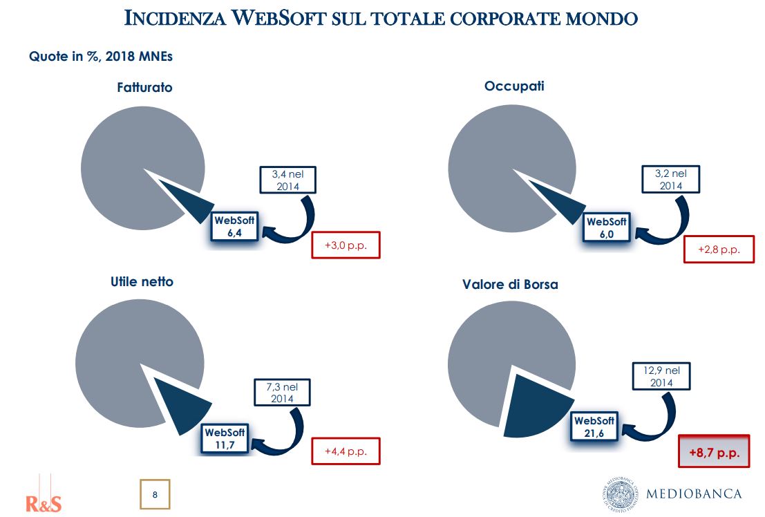 Guardando invece ai numeri generali, il fatturato complessivo delle società Websoft tocca quota 850 miliardi, pari al 6,4% del giro d’affari totale delle multinazionali mondiali. La cifra è cresciuta del +24,5% sul 2017 e del +109,7% sul 2014.