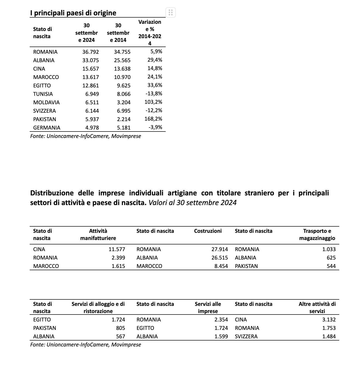 La presenza più solida di artigiani stranieri si registra in settori strategici come costruzioni, ristorazione e trasporti, presidiati in modo particolare da imprenditori provenienti da specifici Paesi. Le aziende nel settore delle costruzioni, ad esempio, vedono una forte presenza di titolari romeni (27.914 unità) e albanesi (26.515 unità), mentre nel settore dei servizi, la Cina e l’Egitto giocano un ruolo significativo, con un’alta concentrazione di attività nel trasporto, magazzinaggio e ristorazione.