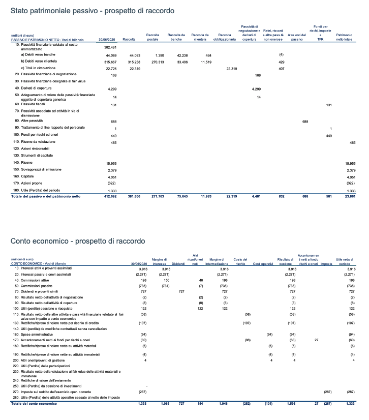 Con riferimento al passivo, la raccolta complessiva al 30 giugno 2020 risulta pari a € 382 Mld, in aumento rispetto al 31 dicembre 2019 (€ 356 Mld). La raccolta postale, in particolare, supera i € 271 Mld (€ 265 Mld a fine 2019) grazie alla performance della raccolta netta di CDP, anche riconducibile al lancio di nuovi prodotti e all’attivazione di nuovi servizi digitali, che hanno contribuito ad una significativa crescita delle vendite sul canale online (+85% rispetto al primo semestre 2019).