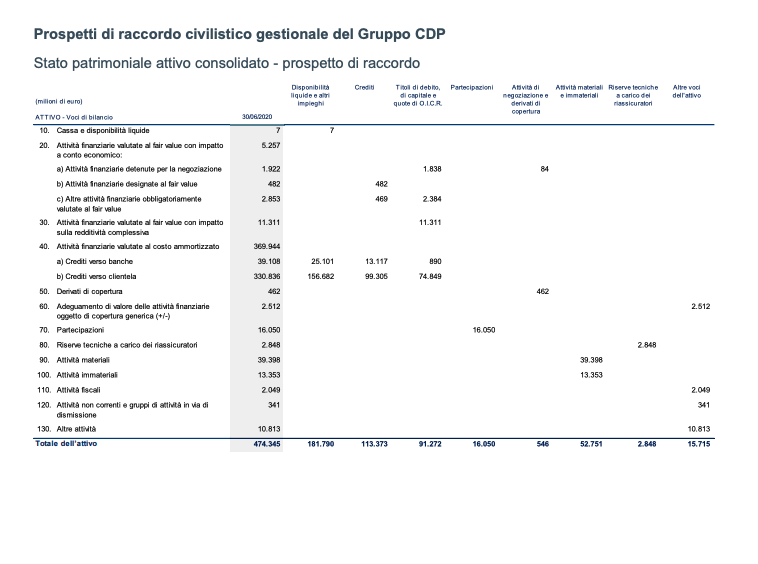 I dati di CDP, di seguito presentati, sono rappresentati dai dati patrimoniali ed economici individuali, riclassificati secondo criteri gestionali, come illustrati nei prospetti di raccordo. I dati comparativi si riferiscono ai dati riclassificati relativi al 31 dicembre 2019 per la situazione patrimoniale ed al 30 giugno 2019 per la situazione economica.
