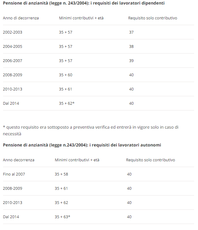 Ma la questione si porrà comunque quando, dopo l’estate, si comincerà a ragionare della legge di bilancio e a interrogarsi su come uscire da quota 100 (una misura che – ormai è pacifico – non sarà rinnovata). Anche in questo caso (come nel 2007) c’è un fantasma che si aggira lungo la penisola: la minaccia di un nuovo scalone. Infatti, coloro che non saranno in grado di far valere i requisiti del trattamento anticipato con 42 anni e 10 mesi (un anno in meno se donne) a prescindere dall’età anagrafica, dovranno attendere la pensione di vecchiaia a 67 anni (con almeno venti anni di contributi). Vi sono regole diverse per coloro che sono interamente nel sistema contributivo, ma per andare in quiescenza a 63 anni devono poter disporre di un trattamento pari a 2,8 volte l’importo dell’assegno sociale. Nel 2007, l’allora governo Prodi fu indotto a smorzare lo scalone che sarebbe scattato il 1° gennaio 2008: uno scherzo da prete ereditato dal governo precedente. La riforma del 2004 aveva disposto che dal 1° gennaio 2008, il requisito anagrafico del trattamento di anzianità salisse da 57 a 60 anni (nella pubblicistica era stata introdotta correntemente l’immagine dello scalone) per arrivare gradualmente negli anni successivi a 61-62 anni per i lavoratori dipendenti e a 62-63 per gli autonomi (il limite rispettivamente dei 62 e dei 63 anni era condizionato ad una verifica degli andamenti del sistema), come è evidenziato nelle seguenti tabelle.