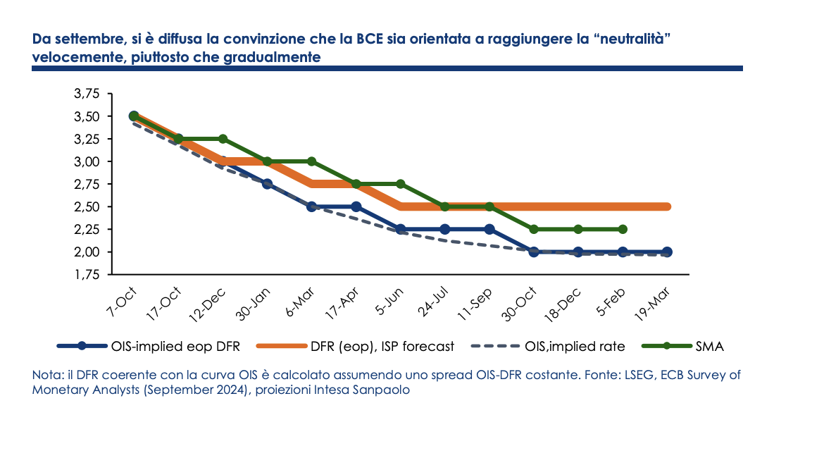 Ci sono diffuse aspettative che la Bce annunci un nuovo taglio dei tassi ufficiali il 17 ottobre. Le continue sorprese negative che arrivano dai dati potrebbero portare a una discesa più rapida dei tassi nei prossimi mesi, fino a raggiungere l’area di ipotetica neutralità.