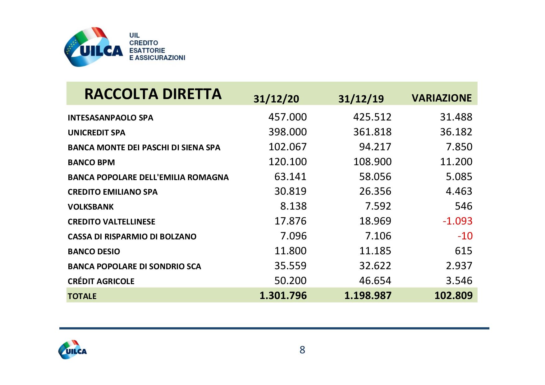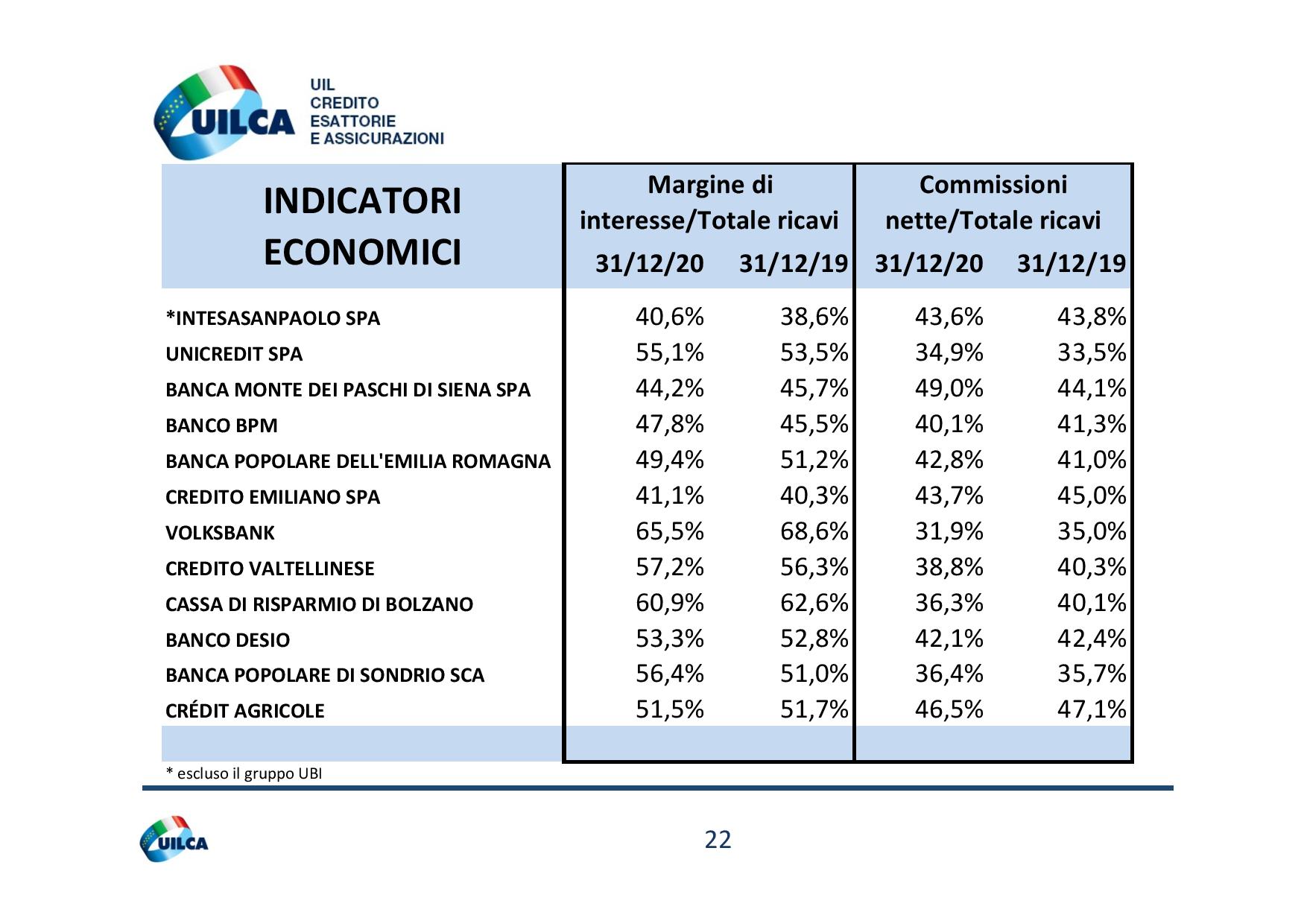 Per avere qualche notizia sulla situazione patrimoniale si può spulciare l’analisi fatta dall’ufficio studi della Uilca, la sigla che si occupa di credito per il sindacato di Via Lucullo, sui dati societari di Intesa Sanpaolo, Unicredit, Mps, Banco Bpm, Bper, Credem, Volksbank, Creval, Cassa di Risparmio di Bolzano, Banco Desio, Banca Popolare di Sondrio, Crédit Agricole. Si scopre così che tra fine 2019 e il 14 febbraio scorso il valore è diminuito in media del 13%, con punte di -36% in Unicredit e di -21% in Montepaschi. Segno meno anche per Ca’ de Sass (-1%) e per Credem (-5%), per il resto tutti con il segno più.