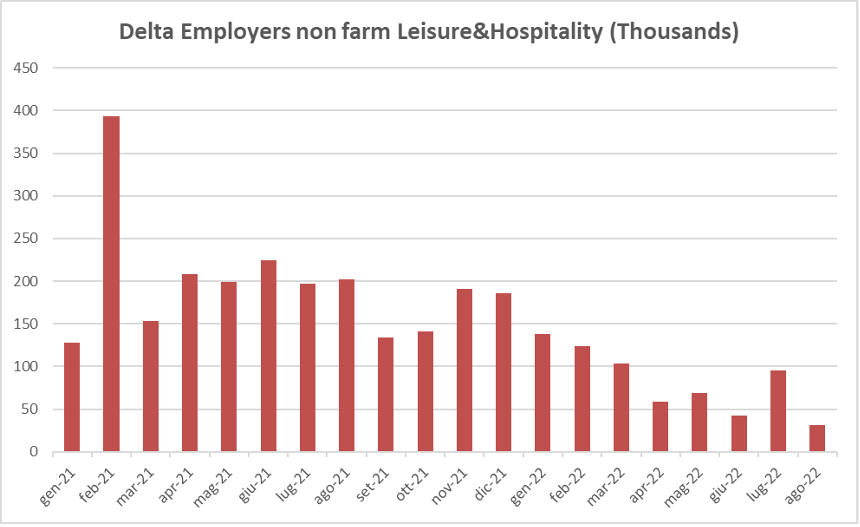 Un’ulteriore indicazione che emerge dal dato è come progressivamente stia diminuendo l’apporto all’occupazione della componente leisure and hospitality, in parte ricollegabile ai sintomi di riduzione del cosiddetto “revenge spending” che si è riscontrato anche da analoghe componenti dell’inflazione.