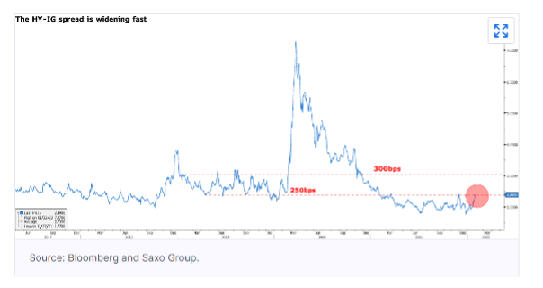 L’unica cosa che potrebbe dissuadere la banca centrale dalla sua agenda aggressiva è il malfunzionamento dei mercati del debito. Finora, non stiamo assistendo ad un andamento a singhiozzo. Tuttavia, l’esodo di investitori di gennaio dalle società con rating inferiore è stato sostanziale. L’ETF iShares iBoxx High Yield Corporate Bond (HYG) ha subito il calo più consistente dei flussi di fondi da settembre 2020. Dall’inizio dell’anno lo spread tra obbligazioni high yield e investment grade è aumentato di 54 punti base. Dimostra che il sentimento di rischio sta cambiando rapidamente nonostante lo spread delle obbligazioni spazzatura rimanga più contenuto rispetto ai livelli pre-pandemia. Pertanto, le società con rating inferiore si troveranno presto ad affrontare un contesto finanziario difficile. A quel punto, la Federal Reserve dovrà decidere tra combattere l’inflazione e finanziare la stabilità.