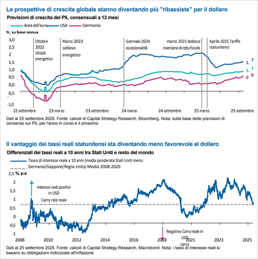 I fattori strutturali che hanno sostenuto il dollaro statunitense negli ultimi tre anni sembrano attenuarsi. Questi cambiamenti potrebbero segnalare una finestra tattica di debolezza del dollaro USA fino al 2026. Fino a poco tempo fa, gli Stati Uniti si distinguevano per la loro crescita persistente a lungo termine, sostenuta da una robusta spesa dei consumatori. Tuttavia, i dati hanno ora registrato un rallentamento. In prospettiva, la combinazione di incertezza politica, pressioni tariffarie e raffreddamento del mercato del lavoro dovrebbe mantenere l’economia su un percorso di debolezza.