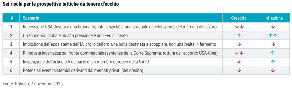 Nello scenario rialzista, l’attenuazione degli shock geopolitici e il miglioramento dei consumi interni in Cina danno impulso alla crescita globale, spingendo il PIL statunitense al 2,9% e provocando un apprezzamento del dollaro. All’opposto, lo scenario ribassista di Robeco prevede un affievolimento dell’eccezionalità statunitense, lo scoppio della bolla dell’IA e un aumento della disoccupazione, che potrebbero innescare una lieve recessione.