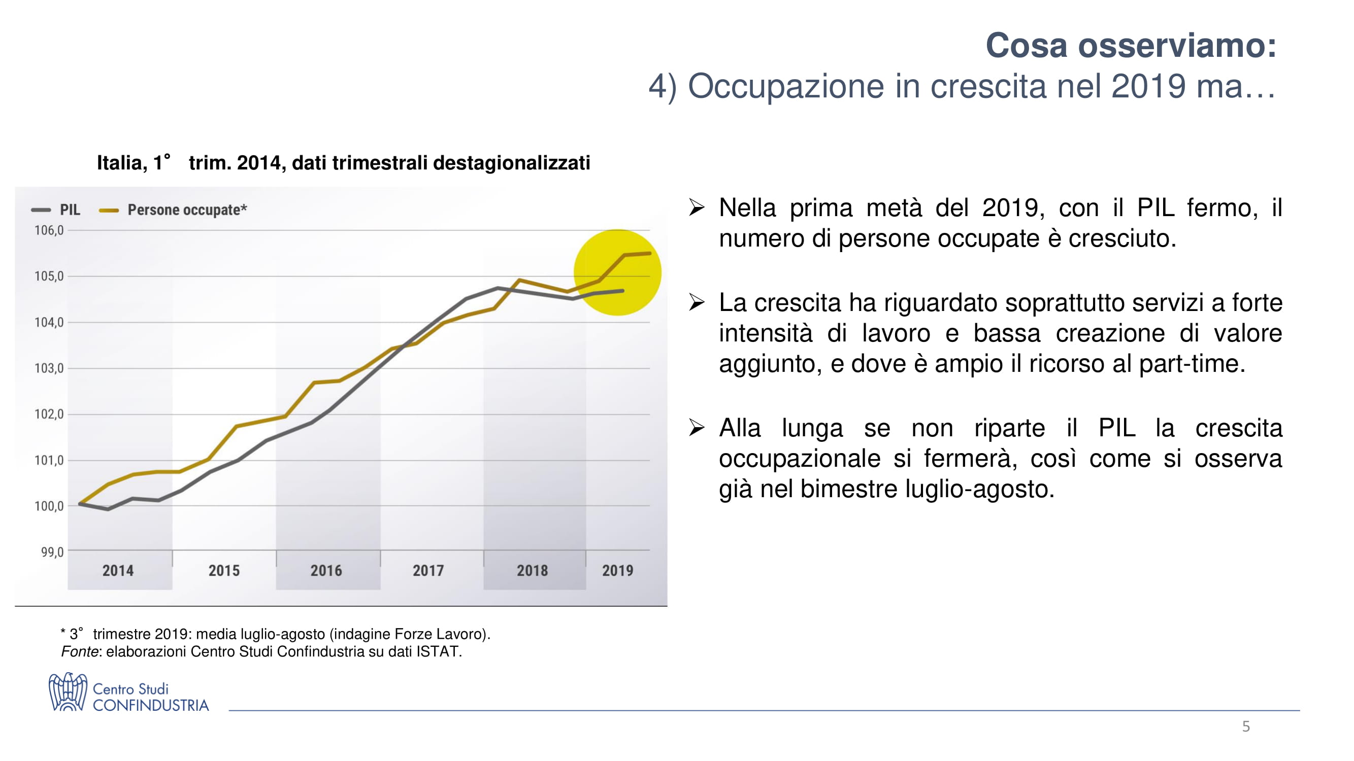 Italia in bilico tra ripresa e recessione. È il Csc, il centro studi di Confindustria diretto da Andrea Montanino, a confermare infatti la sostanziale stagnazione del 2019 con un Pil a crescita zero che in caso di rialzo Iva potrebbe bissare il risultato anche nel 2020: solo una sterilizzazione dell’Iva infatti consentirebbe al Pil del prossimo anno di salire del +0,4%.