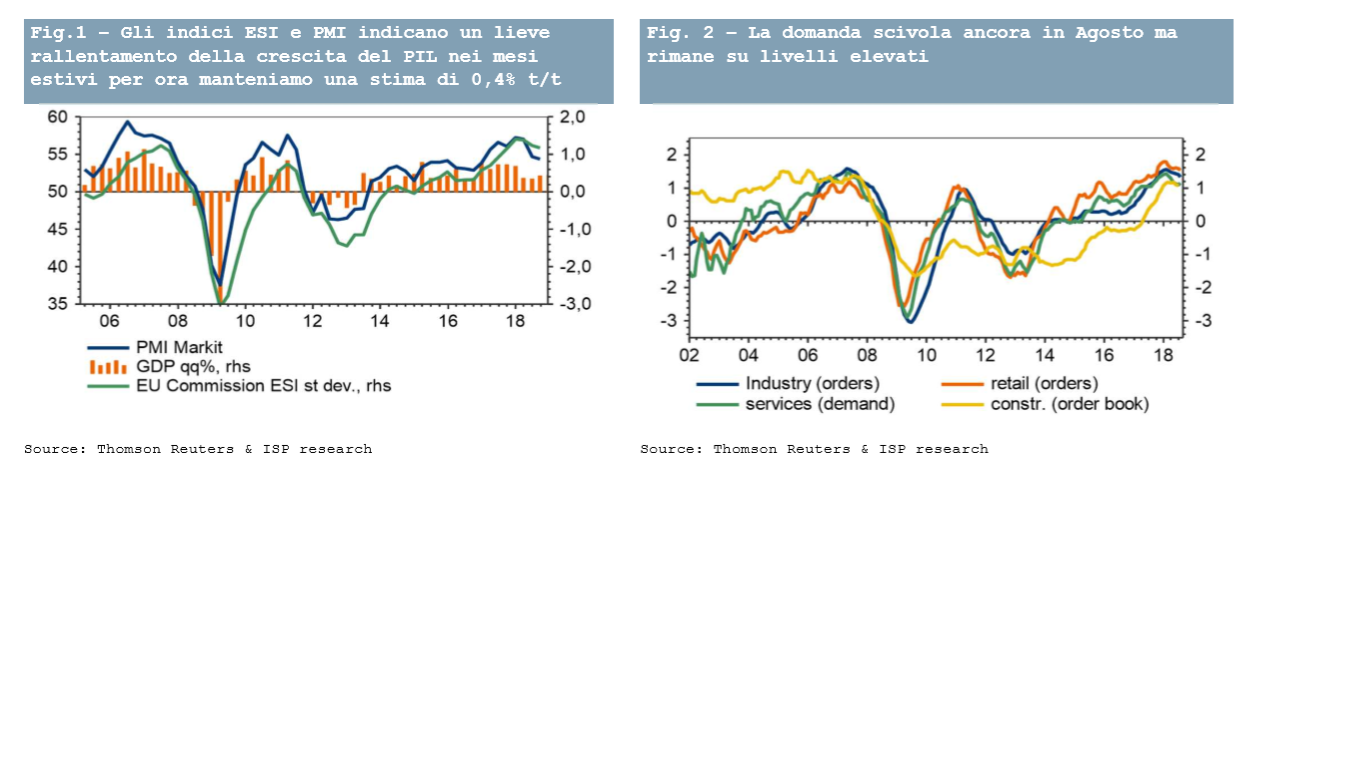 L’indagine di agosto segnala che le attese di prezzo aumentano gradualmente in tutti i settori e che le prospettive occupazionali rimangono solide nel complesso. L’indice Esi si è aggirato in media nei mesi estivi mezzo punto al di sotto del livello del 2° trimestre 112,5, anche il Pmi composito e scivolato dai livelli primaverili (54,4 da 54,7). Gli indici di fiducia indicano un lieve rallentamento della crescita del Pil euro zona dallo 0,4% t/t del 2° trimestre. Tuttavia, data la volatilità dei dati in agosto, manteniamo per ora una stima di crescita di 0,45 a trimestre nella seconda metà di quest’anno.