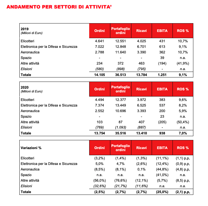 Ricavi: pari a 13.410 milioni di euro, risultano sostanzialmente in linea con il dato del 2019. La riduzione dei volumi produttivi sui programmi aeronautici civili è stata compensata dalla crescita associata al ramp-up delle produzioni su taluni contratti militari (in particolare EFA Kuwait), con i rallentamenti indotti dalla pandemia che hanno di fatto compromesso la prevista crescita dei ricavi