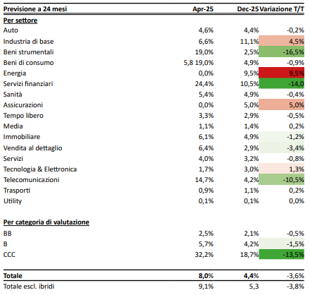 Il miglioramento della nostra previsione è principalmente riconducibile al completamento di diverse operazioni di ristrutturazione e liability management (LME) avvenute dopo aprile 2025. In particolare, SFRFP (Altice France) e INTRUM (Intrum) presentano oggi un margine finanziario migliorato; queste due società, da sole, contribuiscono a quasi due punti percentuali di miglioramento nella nostra previsione a 24 mesi. Analogamente, diversi titoli a rischio più elevato (ad esempio ARGID e KPERST) sono usciti dal nostro perimetro previsionale, con un impatto complessivo di circa un punto percentuale. Per quanto riguarda il mercato nel suo complesso, manteniamo un’impostazione più costruttiva, riflettendo la riduzione dell’incertezza sui dazi e un’attività di rifinanziamento più proattiva. Tuttavia, abbiamo aumentato la nostra valutazione del rischio di default nei settori ciclici, con una serie di emittenti che ora scambiano a livelli di difficoltà finanziaria e avviano processi di LME.