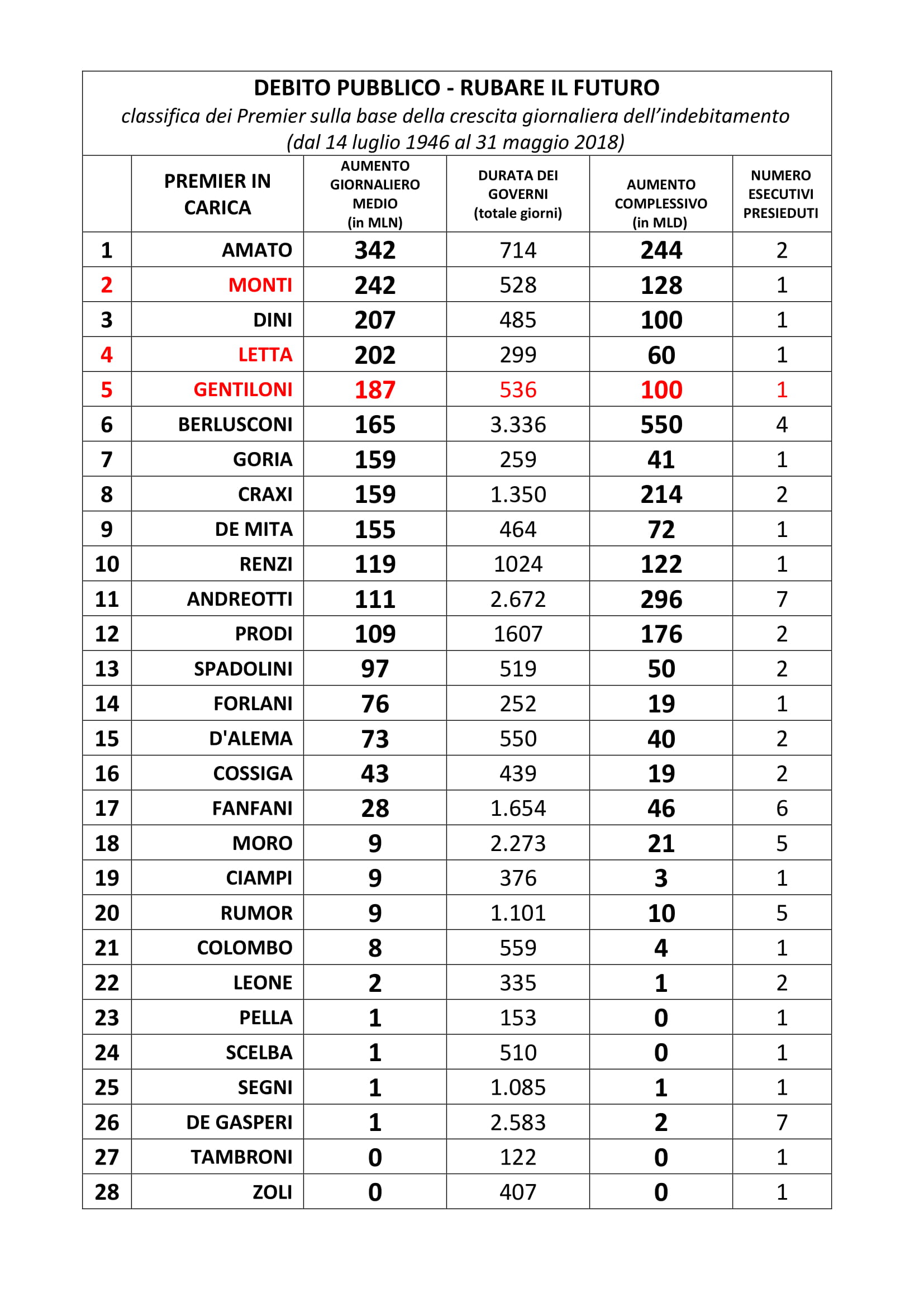 Basta uno sguardo fugace per comprendere veramente come stanno le cose. E fa davvero specie notare che tutti e quattro i governi del cosiddetto “Risanamento post- Berlusconi” (Monti, Letta, Renzi, Gentiloni) sono nella Top Ten, ovvero nei primi nove posti della classifica di chi all’aumento del debito ha impresso il massimo di accelerazione rispetto a chiunque li abbia preceduti.