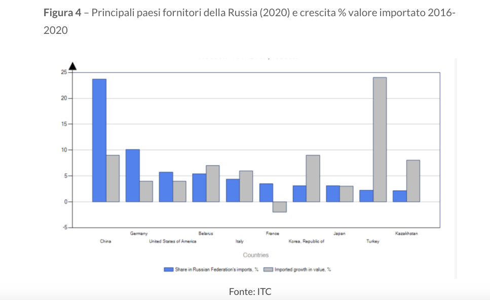 È utile ricordare anche che, rispetto all’inizio di questo secolo, il peso degli scambi commerciali sul Pil per la Russia è diminuito significativamente, da circa il 70 al 46 per cento del 2020 (Figura 2). Se è indubbio che la Russia ha bisogno di esportare, più di altre nazioni del mondo, non è vero che per la Russia esportare sia oggi più vitale che per altri paesi, Germania inclusa.
