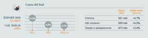 La Corea del Sud è uno dei Paesi che ha saputo contrastare meglio gli effetti della pandemia. Il piccolo Stato orientale è diventato il terzo mercato per i nostri prodotti nella regione a seguito del crollo delle vendite italiane verso Hong Kong (-25,6%). Secondo gli analisti di Sace la domanda coreana di prodotti italiani continuerà con vigore anche nel 2021, superando anche i valori pre-crisi grazie a un tasso di crescita previsto all’11,2%. Il Paese beneficia dell’accordo di libero scambio tra il Paese e la Ue in vigore da un decennio. A guidare la ripartenza saranno i beni di consumo, che valgono per oltre il 40% delle nostre esportazioni. Nel Paese è molto apprezzata la moda italiana, tanto che il tessile e l’abbigliamento rappresentano un quinto delle nostre esportazioni che dovrebbero crescere del 20,2%. Prospettive favorevoli anche per i mezzi di trasporto (+15,4%), che continueranno la crescita dopo il risultato positivo dello scorso anno.