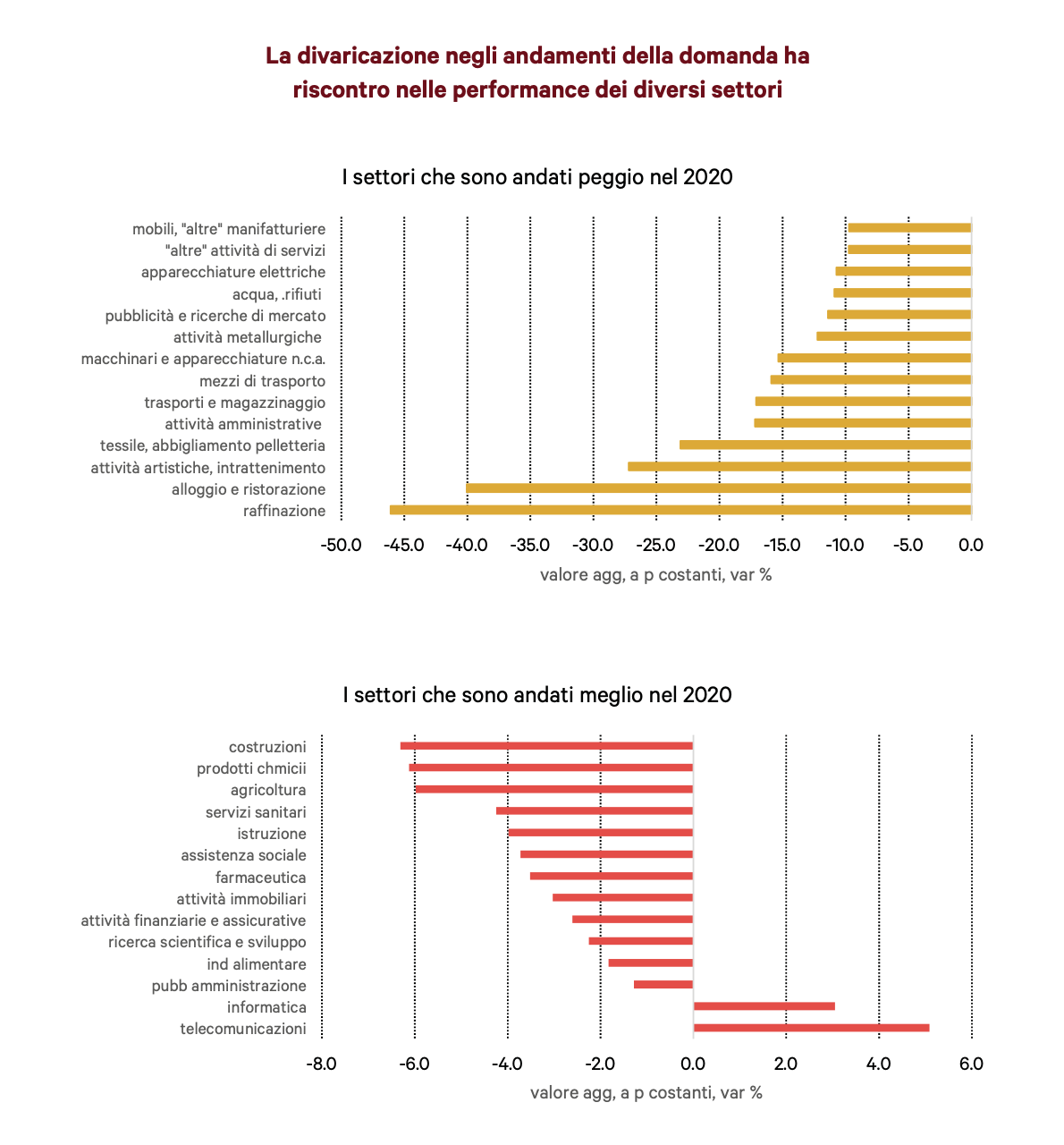 I consumi di servizi sono stati penalizzati, mentre la gran parte degli acquisti di manufatti non ne è stata influenzata, anche grazie al boom delle vendite on-line. La sedentarietà degli stili di vita ha ridotto le spese per l’abbigliamento, ma ha fatto esplodere quelle per l’elettronica e i beni per l’abitazione. Molte imprese industriali nel periodo del lockdown avevano decumulato scorte per ridurre il fabbisogno di liquidità a fronte del crollo dei fatturati e degli incassi.