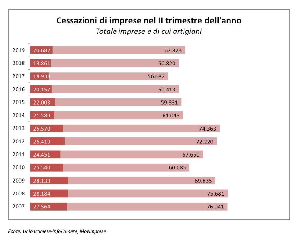 È questa – in estrema sintesi – la dinamica che emerge dalla lettura dei dati ufficiali sulla natalità e mortalità delle imprese italiane nel II° trimestre 2019, diffusi da Unioncamere-InfoCamere.