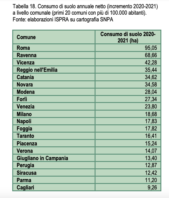 Se consideriamo poi il livello di cementificazione di tutti i comuni italiani, Ravenna, con 68 ettari consumo di suolo in più rispetto al 2020, è preceduta solo da Roma. Gran parte del consumo, afferma l’Ispra, è dovuto ai cantieri del nuovo tracciato del metanodotto, nelle campagne ad ovest della città. Ma tra gli altri comuni con più consumo viene citato anche Reggio nell’Emilia, con circa 35 ettari in più.