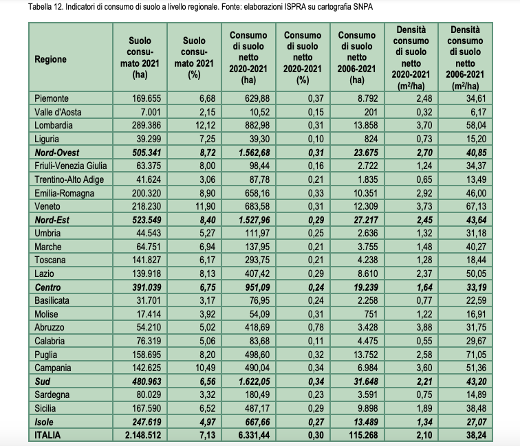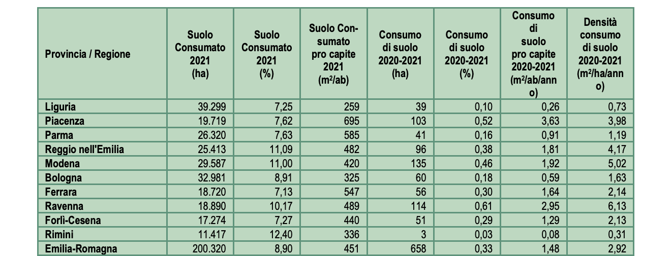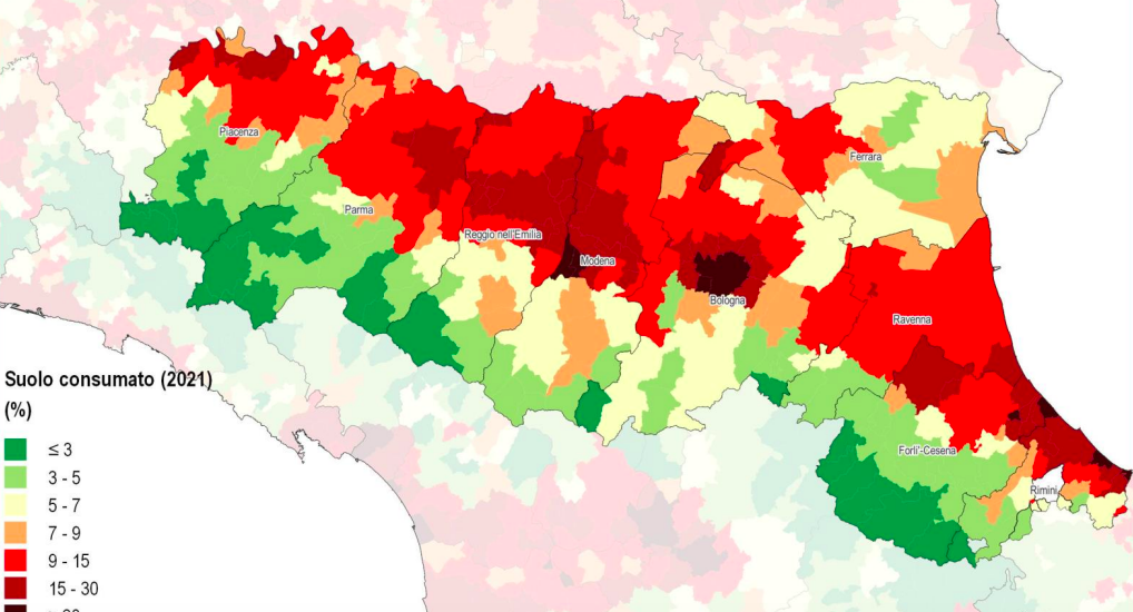 Nella classifica all’interno del rapporto Consumo di suolo, dinamiche territoriali e servizi ecosistemici, edizione 2022, dell’Istituto superiore per la protezione e la ricerca ambientale (Ispra), l’Emilia-Romagna è la quarta regione per consumo di suolo, dietro a Lombardia (12,12%), Veneto (11,90%) e Campania (10,49%). Il suo valore supera infatti la media nazionale ed è compreso tra il 7 e il 9%.