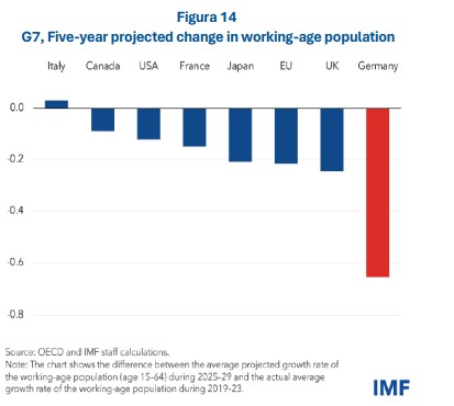 Diversi sono gli elementi che inducono a prevedere un indebolimento della competitività tedesca sui mercati internazionali negli anni a venire. Tra questi, il primo ha a che fare con l’andamento demografico della Germania: secondo le proiezioni di Eurostat, la popolazione in età lavorativa tra 2025 e 2040 subirà una riduzione di circa il 7%; inoltre, sin dal prossimo quinquennio, secondo il già citato articolo del FMI, la Germania registrerà il calo più marcato tra i paesi del G7 nel tasso di crescita della popolazione tra i 15 e i 64 anni (Figura 14).
