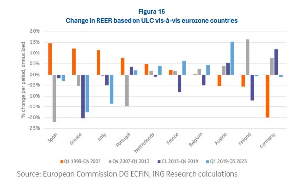 Tale andamento demografico avrà molto probabilmente un impatto significativo su diversi aspetti dell’economia tedesca, tra cui in primis il costo del lavoro: già nel 2023, per far fronte all’inflazione, i salari nominali sono cresciuti del 6,3% su base annua, una tendenza che facilmente andrà rafforzandosi negli anni a venire e che comporterà un calo della competitività delle merci tedesche sui mercati internazionali. Sempre per quanto riguarda il costo del lavoro, è da tenere in considerazione il processo di ribilanciamento che, a partire dalla crisi del debito sovrano, ha portato i paesi “periferici” dell’area euro a recuperare terreno in termini di competitività di costo rispetto ai paesi del Nord Europa.