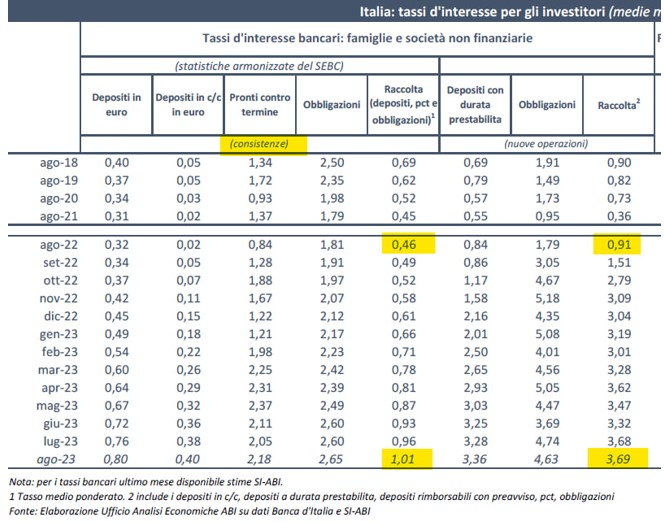 E né vale come argomento a difesa, il fatto che il tasso sulle “nuove operazioni” sia salito da 0,91% a 3,69%, come ci tiene ad evidenziare l’ABI. Perché – come amava dire Totò, “è sempre la somma che fa il totale” – il conto economico si fa con la massa dei depositi (cioè le consistenze) e non con le nuove operazioni, per le quali aumentare i tassi non ha inciso granché sul margine di interesse.