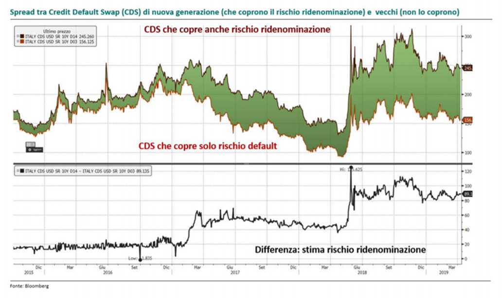 Osservando il grafico che confronta i due CDS, quello vecchio che tutela solo dal rischio di default su titoli italiani e quello nuovo che, invece, protegge anche dal rischio di Italexit e dunque di ridenominazione del debito in una nuova lira svalutata rispetto all’euro, si nota come sia il primo – ovvero il rischio default – a essersi ridotto nell’ultimo periodo mentre il secondo resti stabile. Questo gap dipende dall’incertezza politica. Nell’ipotesi di eventuali elezioni anticipate con un rimescolamento del Parlamento a favore della Lega e quindi di un divorzio in casa in funzione di un governo di centro destra, sarebbe necessario – per chiudere lo spread – che la Lega si spogliasse della retorica anti-euro che ha caratterizzato l’ultimo anno. Se questa ipotesi dovesse concretizzarsi, comporterebbe un margine di compressione rilevante, misurabile in circa mezzo punto. Attualmente lo spread intorno ai 250 punti base rende i BTP cari anche perché i valori che afferiscono alle determinazioni di sostenibilità della finanza pubblica non sono positivi. Salvo un ingrediente che è ciò che ha risparmiato finora il Paese da potenziali scossoni: ovvero il fatto che la curva dei rendimenti attuali implica per il Tesoro un costo delle nuove emissioni inferiore a quello del rendimento storico del debito pubblico. L’Italia si trova di fatto sotto uno scudo per cui gode di condizioni di rifinanziamento agevolato che non la fanno avvitare sul piano inclinato della insostenibilità dal punto di vista almeno del coefficiente dinamico, ovvero del rapporto tra crescita reale e tassi reali (che rimane negativo ma in progressivo miglioramento). Queste condizioni particolarmente favorevoli potrebbero venire meno nel momento in cui lo spread aumentasse (oltre i 350bp).