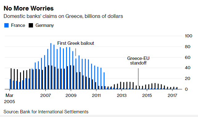 Francia e Germania si dimostrarono allora clementi con il governo di Atene offrendo ampio margine per uscire dalla crisi finanziaria. Ma cinque anni dopo, il neoeletto capo del governo greco Tsipras, incaricato di rinegoziare il debito nazionale, trovò Parigi e Berlino molto meno concilianti e votati all’imposizione dell’austerity. Guarda caso le esposizioni delle loro si erano ridotte a meno di 8 miliardi di dollari, ricorda l’analisi di Bloomberg.
