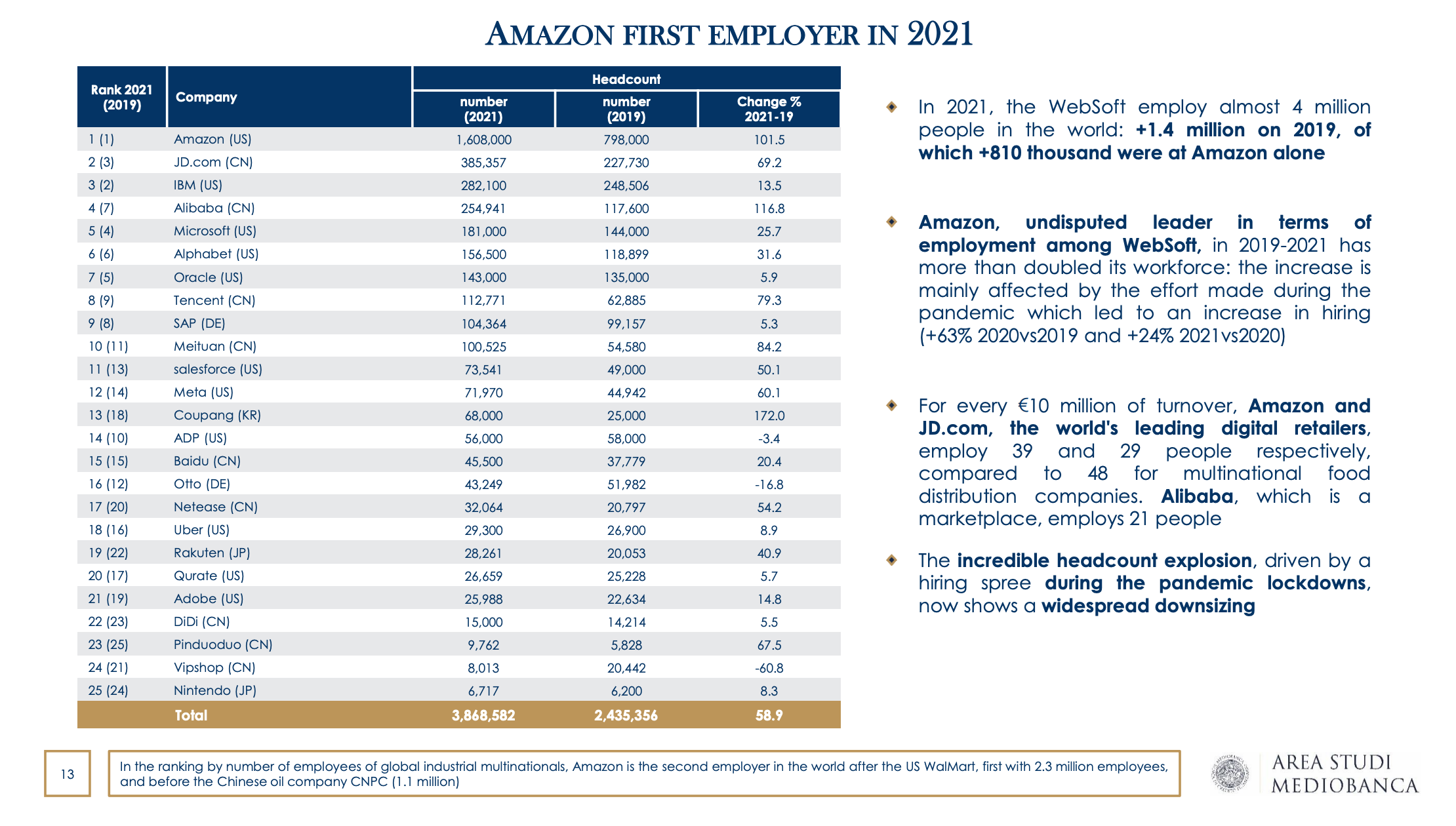 E anche nel nostro paese, il gruppo fondato da Jeff Bezos vanta il maggior numero di occupati in Italia (11.911 unità nel 2021).