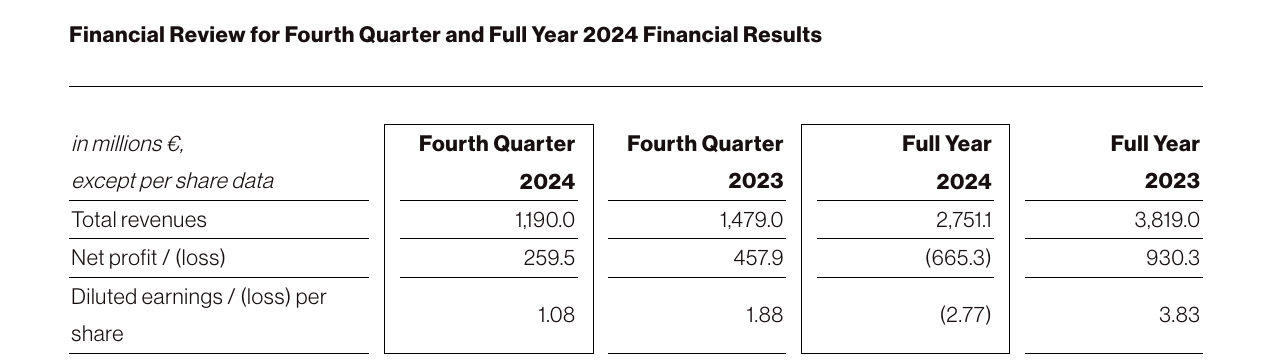 L’utile netto è stato pari a 259,5 milioni di euro per i tre mesi conclusi il 31 dicembre 2024, rispetto ai 457,9 milioni di euro di utile netto del periodo comparativo dell’anno precedente. Per l’intero anno, la perdita netta è stata pari a 665,3 milioni di euro, rispetto a un utile netto di 930,3 milioni di euro nel 2023.
