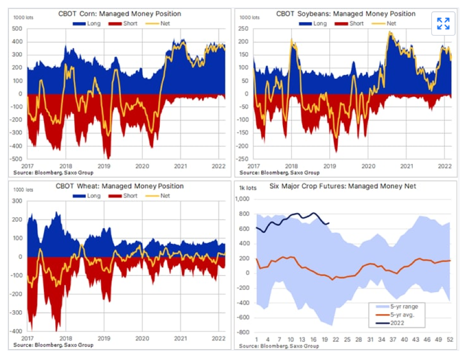 Nella settimana fino al 17 maggio, gli speculatori o i conti con denaro gestito hanno aumentato le scommesse rialziste sul grano di Chicago al massimo di 14 mesi, ma a “soli” 26.586 lotti, l’impatto sui prezzi rimane relativamente contenuto. Complessivamente, tuttavia, l’esposizione sui sei principali futures sul grano scambiati a Chicago rimane elevata a 683.000 lotti, per un valore nominale di $ 37 miliardi, con la maggior parte detenuta in mais (340.000 lotti) e soia (147.000 lotti). Negli ultimi 20 anni il net long ha superato gli 800.000 lotti solo in quattro occasioni, le ultime due a gennaio dello scorso anno e solo cinque settimane fa. Nelle prime tre occasioni, i prezzi sono crollati a tal punto che la lunghezza netta in due occasioni è tornata a zero mentre l’anno scorso ha innescato una riduzione del 60%.