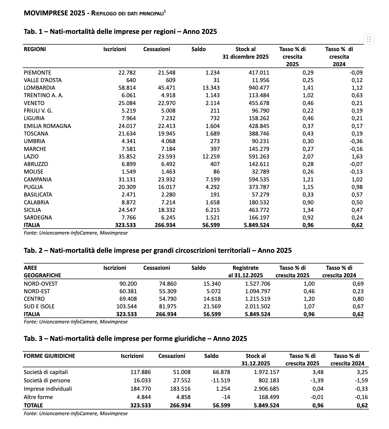 È quanto emerge dai dati Movimprese, elaborati da Unioncamere e InfoCamere sulla base del Registro delle imprese delle Camere di commercio. In particolare, il sistema imprenditoriale italiano chiude il 2025 con un segnale di vitalità, mettendo a segno un saldo positivo di 56.599 imprese. Il dato riflette una crescita dello stock dello 0.96%, un risultato superiore sia a quello del 2024 (+0,62%) sia a quello del 2023 (+0,70%).A determinare questo rafforzamento della base produttiva è stata la combinazione tra una sostanziale tenuta delle nuove iscrizioni (323.533 unità, in linea con il 2024) e, soprattutto, una significativa contrazione delle cessazioni di attività esistenti, scese a 266.934 unità (-6,7% rispetto all’anno precedente). Alla fine del 2025, lo stock complessivo delle imprese registrate in Italia si attesta a 5.849.524 unità