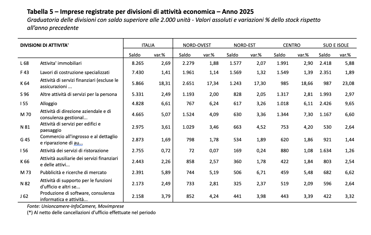 Scendendo nel dettaglio delle singole divisioni economiche, l’analisi evidenzia una gerarchia della crescita molto netta. Il contributo più rilevante in termini assoluti viene dalle Attività immobiliari, che chiudono l’anno con un saldo di 8.265 imprese in più (+2,69%) e dai Lavori di costruzione specializzati (+7.430 unità, pari ad una crescita dell’1,41%).