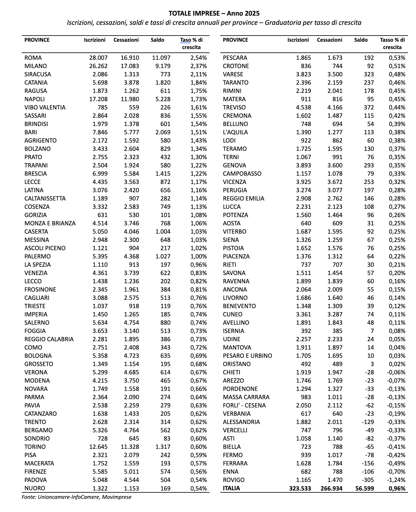 Tra le regioni, il Lazio si conferma la più vivace con un tasso di crescita del 2,07% (+12.259 imprese), seguita dalla Lombardia (+1,41%, pari a +13.343 unità) e dalla Sicilia (+1,34%). A livello provinciale, le performance migliori in termini di tasso di crescita spettano a Roma (+2,54%), Milano (+2,37%) e Siracusa (+2,11%).