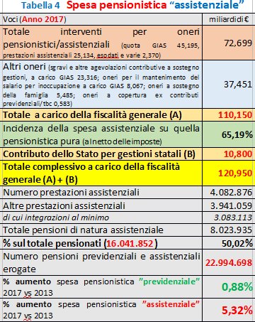 A completamento delle informazioni sul mondo Inps si ritiene utile riportare una Tabella 4 che esplicita l’onere a carico della fiscalità generale ammontante complessivamente nel 2017 a 120,950 miliardi di euro.