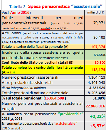 A completamento delle informazioni sul mondo Inps si ritiene utile riportare una Tabella 2 che esplicita l’onere a carico della fiscalità generale ammontante nel 2016 a 118,174 miliardi di euro.