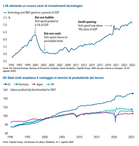 Gli investimenti nell’AI hanno superato quelli dell’era dot-com, con la maggior parte della spesa destinata ai data center. I beneficiari, tra cui le aziende produttrici di semiconduttori, industriali e di energia elettrica, hanno visto i prezzi delle loro azioni reagire di conseguenza. Questo implica che ci stiamo dirigendo verso un crollo tecnologico simile a quello del 2000? Non escludiamo un “inverno dell’IA”, ma la rivoluzione dei PC degli anni ’90 era diversa. Si concentrava su hardware, connettività, reti e informazioni, mentre l’IA riguarda l’estrazione di conoscenze accumulate. E a differenza dell’era delle dot-com, oggi le aziende dispongono di ingenti liquidità e di utili solidi.