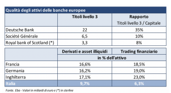 Anche il trading finanziario vale in Italia appena il 6,3% dell’attivo di bilancio contro il 23% delle banche inglesi, il 18,5% delle banche francesi e il 19% delle banche tedesche. Entrando nel dettaglio di alcuni istituti bancari europei, per Deutsche Bank il peso dei “titoli di livello 3” risulta ben più alto rispetto alla media della Germania e dell’Italia e pari al 35% del capitale.