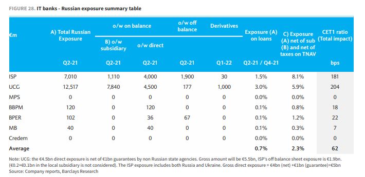 Come indicato anche dallo schema di Barclays, Intesa Sanpaolo è la seconda banca italiane per esposizione alla Russia, preceduta da UniCredit. L’istituto britannico afferma di prevedere livelli più elevati di crediti deteriorati (NPL), e di conseguenza accantonamenti per perdite su crediti (LLP) più alti, per le banche esposte alla Russia.