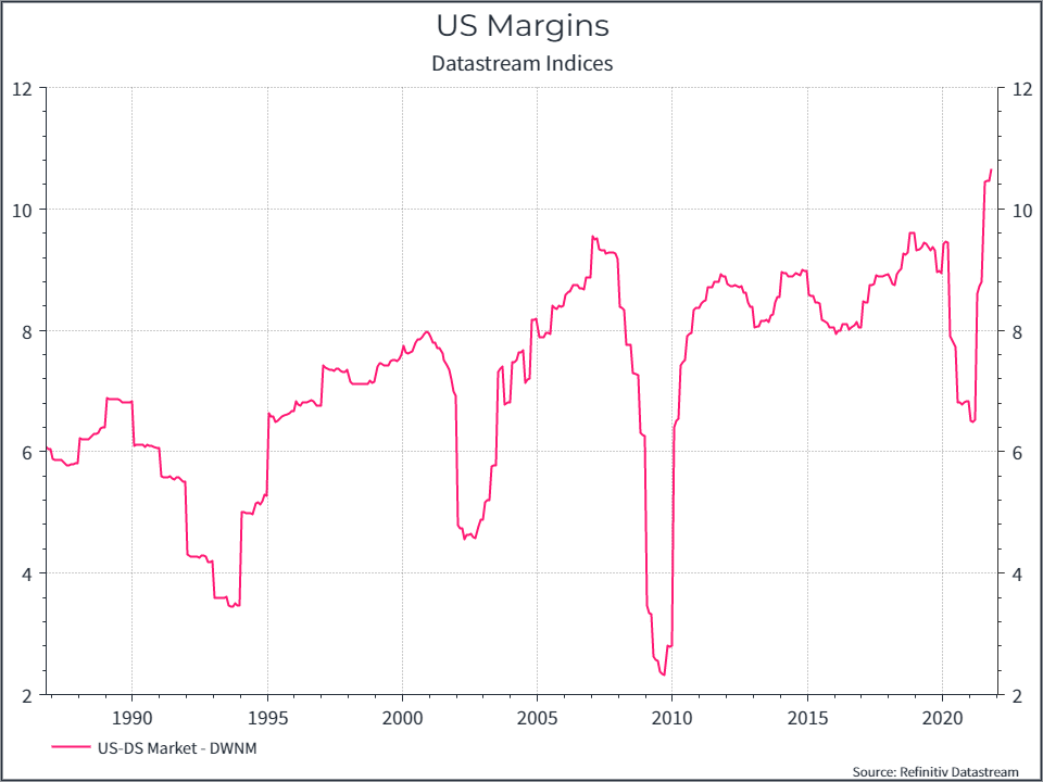 Il grafico qui sotto mostra i margini a lungo termine per le aziende Usa. Pur non includendo l’attuale stagione degli utili, si nota chiaramente quanto le società statunitensi abbiano migliorato la propria redditività negli ultimi trent’anni. Quanto questa tendenza sia sostenibile nel lungo termine resta invece motivo di dibattito.