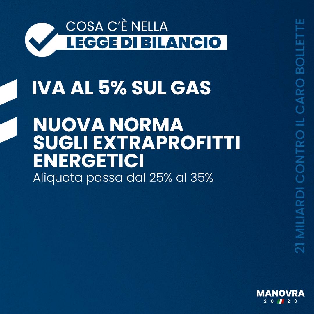 Le risorse destinate alle misure contro caro energia per i primi tre mesi del 2023 che consentiranno di aumentare gli aiuti a famiglie e imprese allargando anche la platea dei beneficiari ammontano a oltre 21 miliardi di euro. Nel dettaglio, confermata l’eliminazione degli oneri impropri delle bollette, rifinanziato fino al 30 marzo 2023 il credito d’imposta per l’acquisto di energia elettrica e gas naturale che per bar, ristoranti ed esercizi commerciali salirà dal 30% al 35% mentre per le imprese energivore e gasivore dal 40% al 45%.