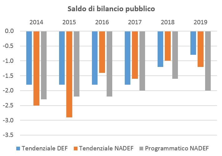 Tanto per capirci, cominciando da sinistra per finire a destra (un percorso naturale): con riferimento all’anno 2014 vedete che ad aprile 2013 il DEF (varato da Monti) supponeva che a politiche invariate il saldo sarebbe stato negativo per -1.8 (percentuale del Pil), poi la NADEF (redatta da Enrico “stai sereno” Letta) ipotizzava che si sarebbe fatta una politica espansiva fino al -2.3% del Pil, ma a conti fatti il risultato fu un -3.0% tondo (peggiore di 1.2 rispetto al tendenziale e di 0.7 rispetto al programmatico).